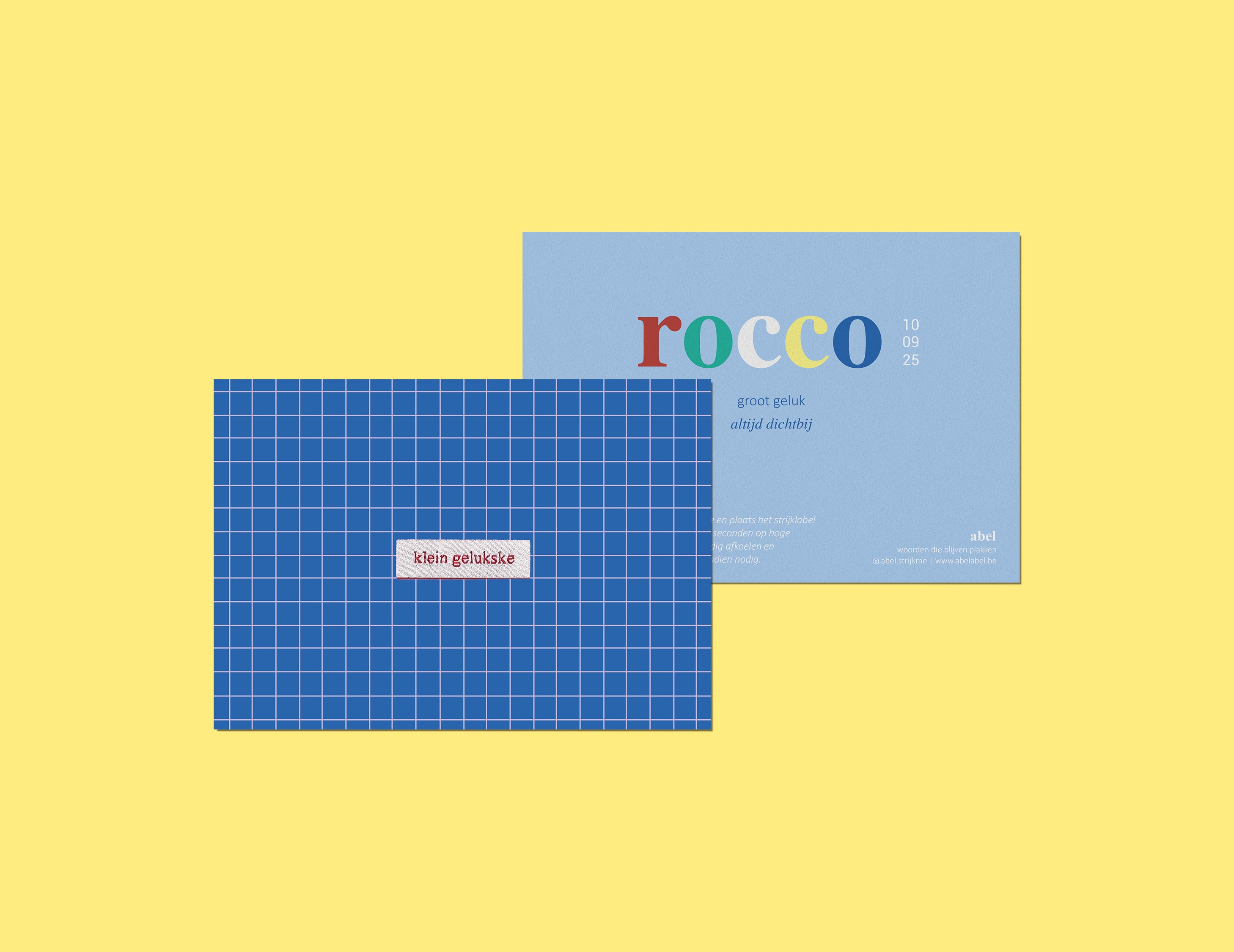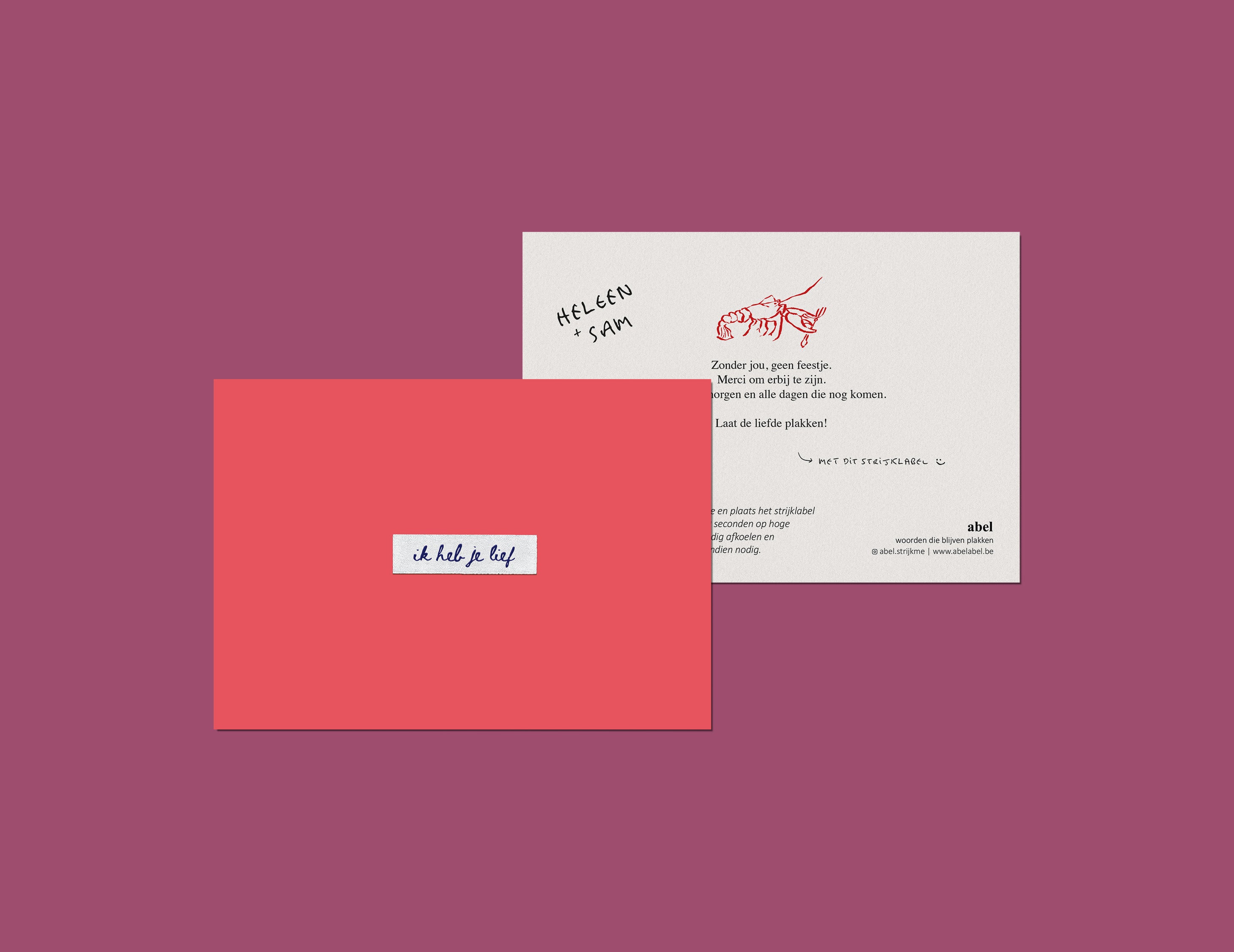 Abel ontstond uit een herinnering aan mijn oma’s naamlabels. Witte geweven lintjes met onze achternaam in rode sierletters, zorgvuldig genaaid in elke (ja, élke) jas, zakdoek of trui. Vandaag duiken ze nog steeds onverwacht op. Dan is het alsof ze weer even hier is.
